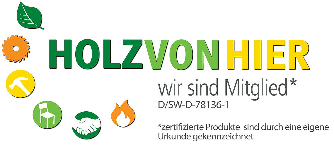 Holz von Hier ist ein Umweltlabel, welches Holzprodukte auszeichnet, die sowohl aus nachhaltiger Waldwirtschaft stammen, als auch überdurchschnittlich klimafreundlich mit kurzen Wegen entlang der gesamten Verarbeitungskette hergestellt wurden. Gerne erstellen wir Ihnen Ihr persönliches Zertifikat, dass die zurückgelegten Kilometer Ihres Produkts aufzeigt. Mit der Nachfrage und Verwendung von so gekennzeichneten Produkten leisten Sie und wir einen konkreten und wichtigen Beitrag zum Klimaschutz.